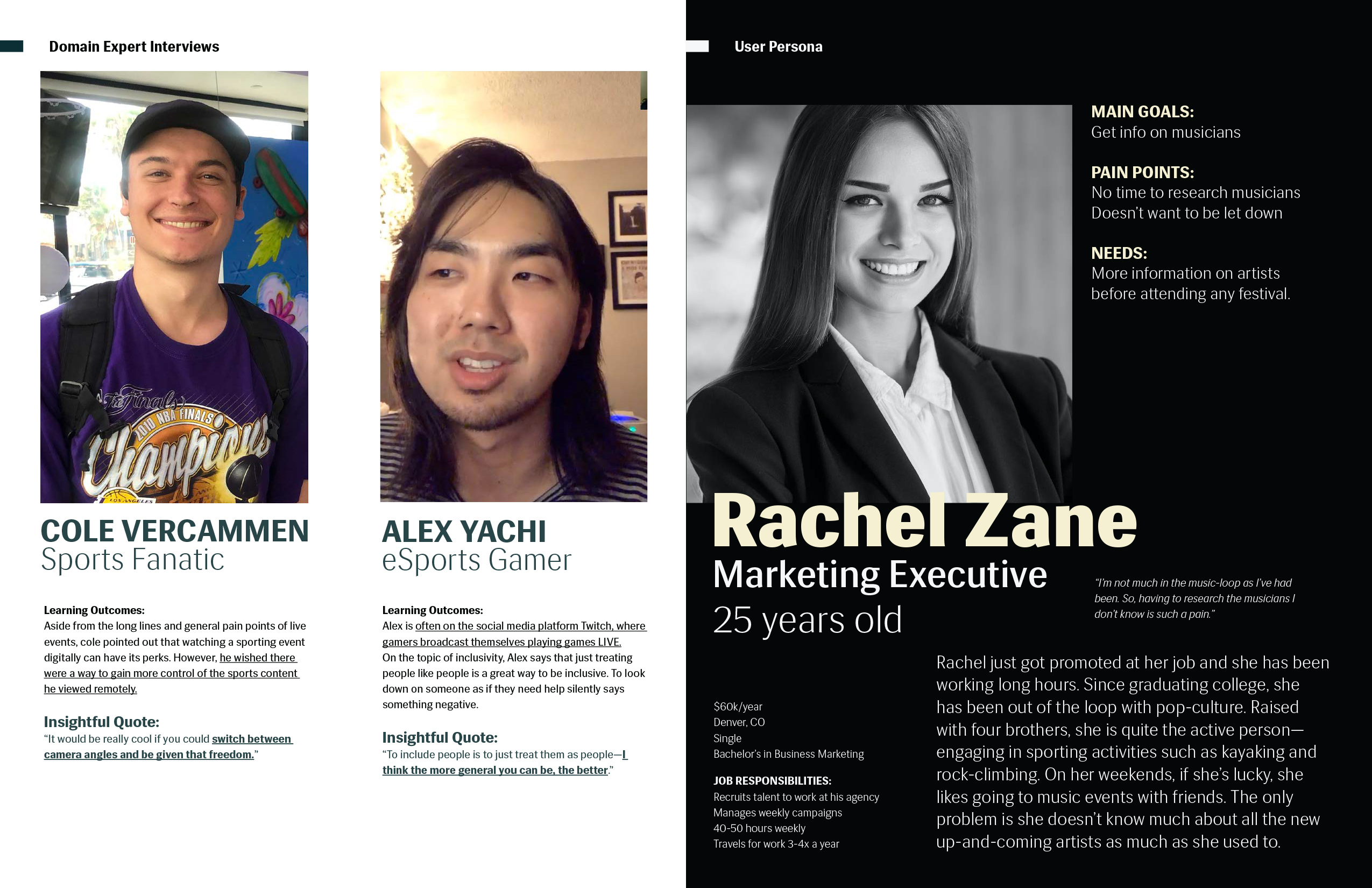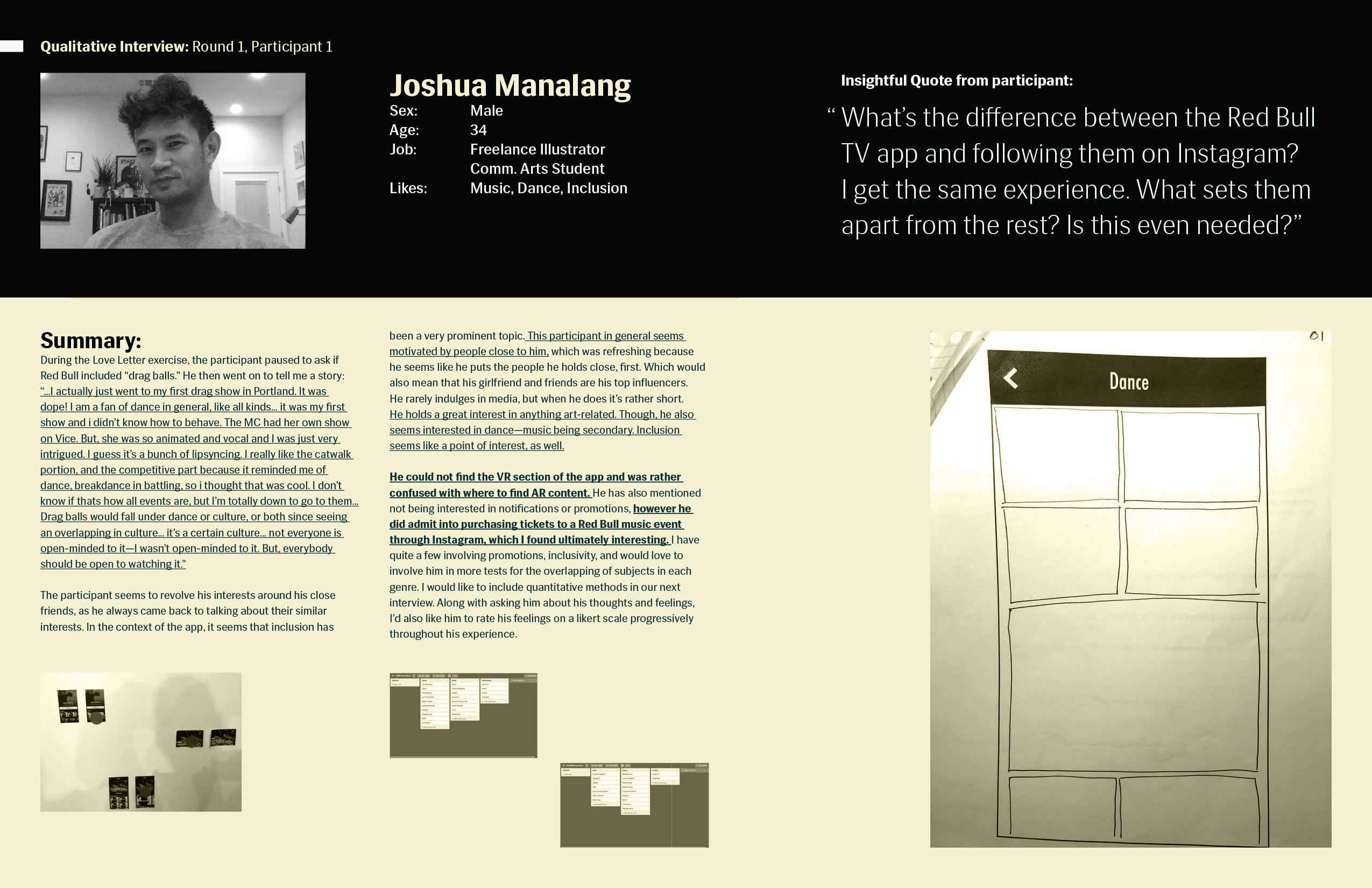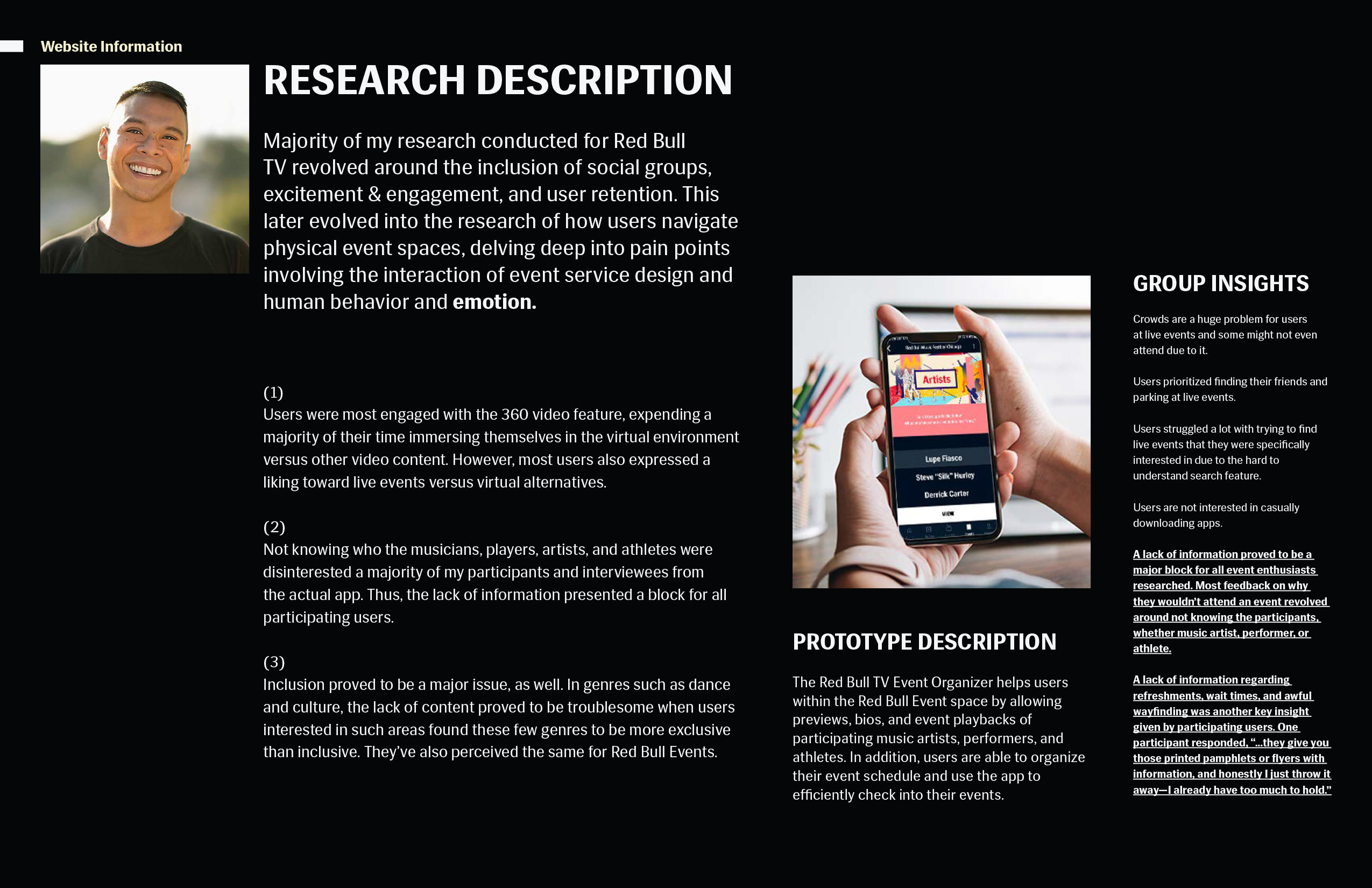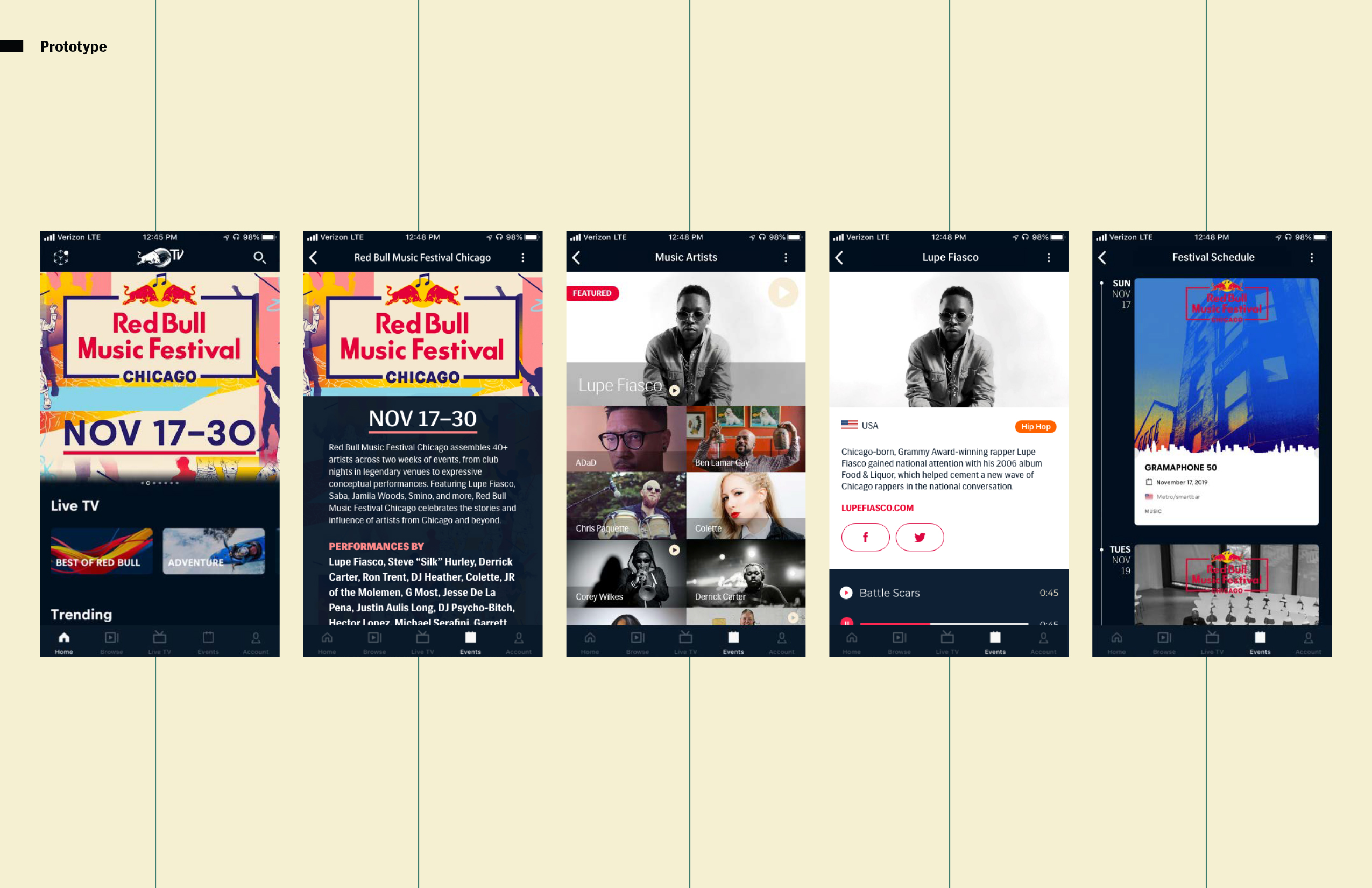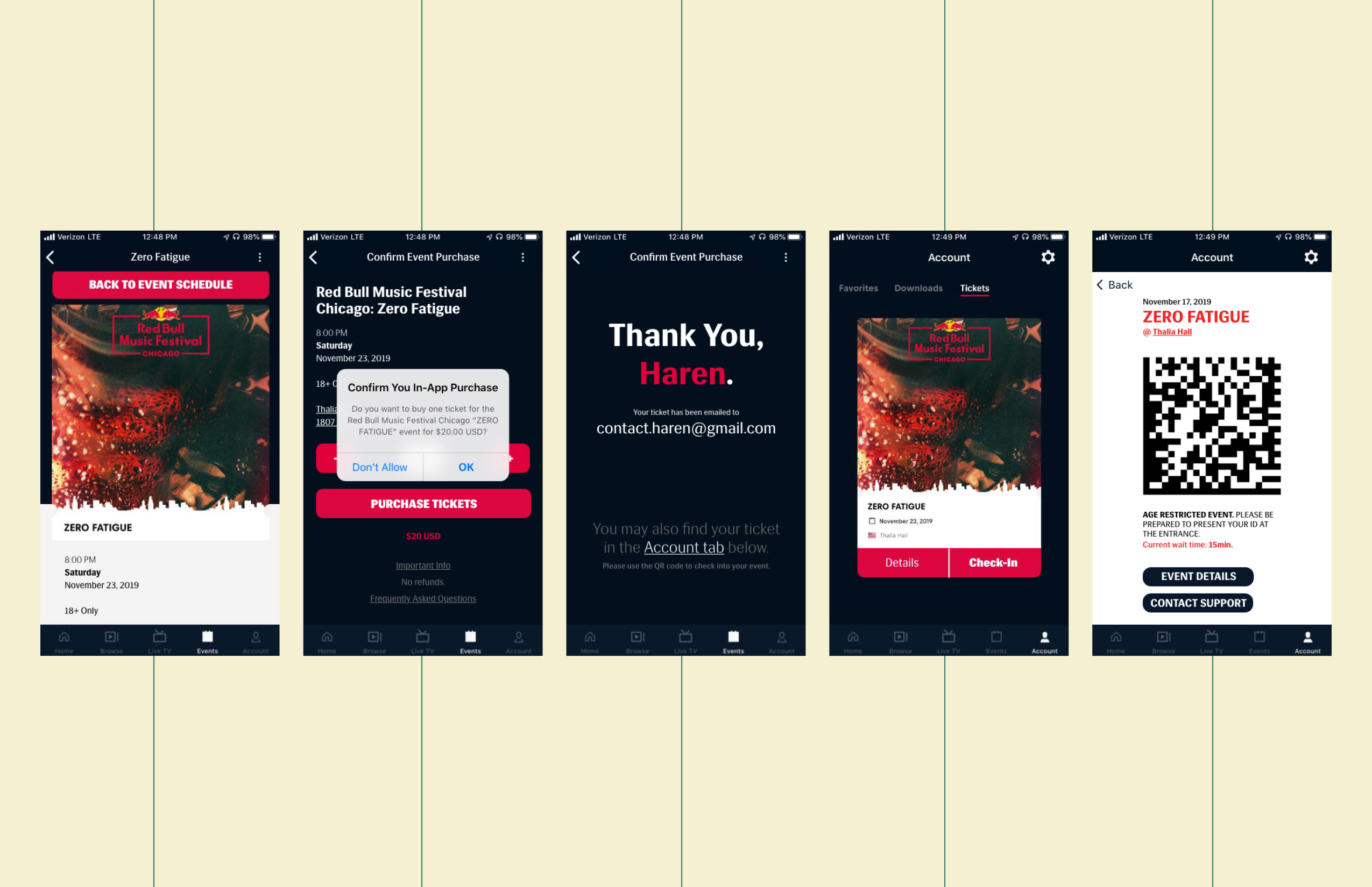 The In-App Event Organizer for the Red Bull TV Mobile app is for Red Bull TV users who go to live music events, but are inclined to not participate due to a lack of information and perceived disorganization of the general event service process. This is to engage the current audience in Red Bull events through the Red Bull TV app, increasing the interaction between users and content within the Red Bull event space. And unlike YouTube and Ticketmaster, my product will not only cover the event live, but give users the freedom to explore an event prior to purchasing in-app. In addition to organizing event information conveniently in one place, users who have purchased tickets to an event in-app are able to exclusively check-in digitally, bypassing long general admission lines and increasing user retention for the mobile app by serving a need for the user.