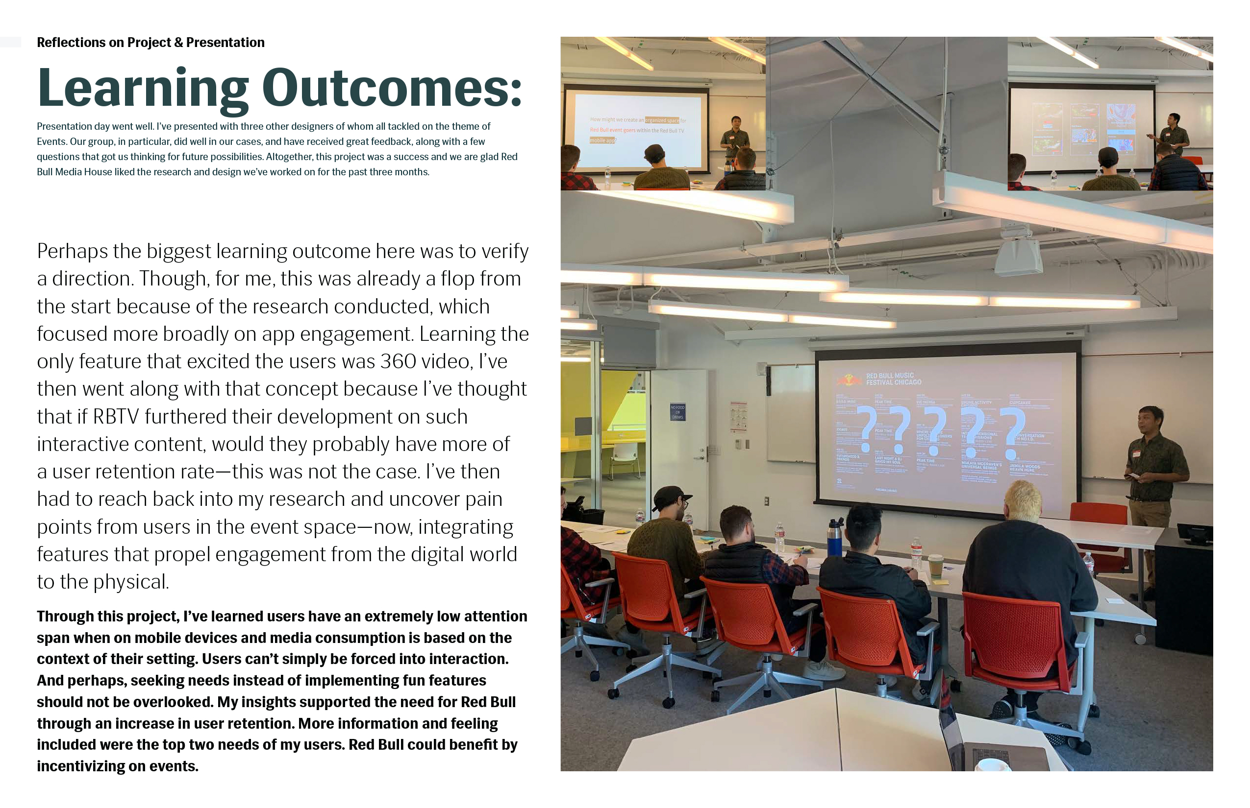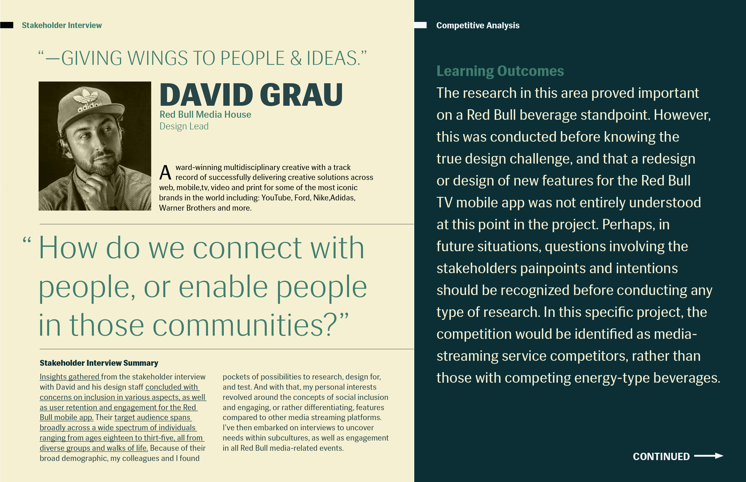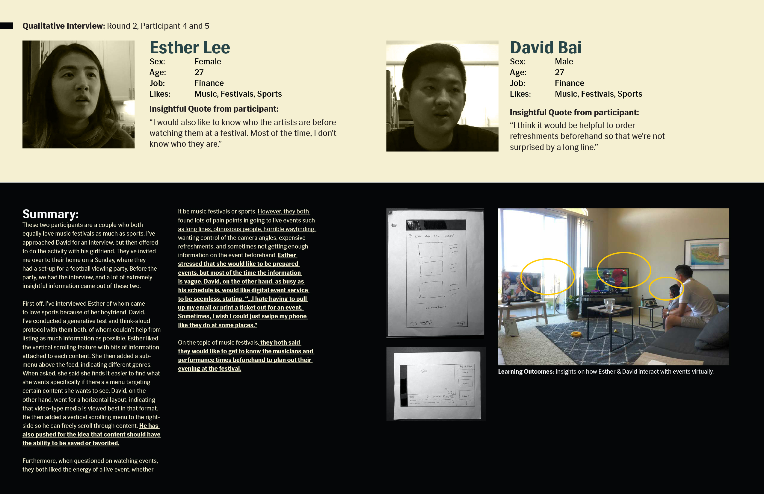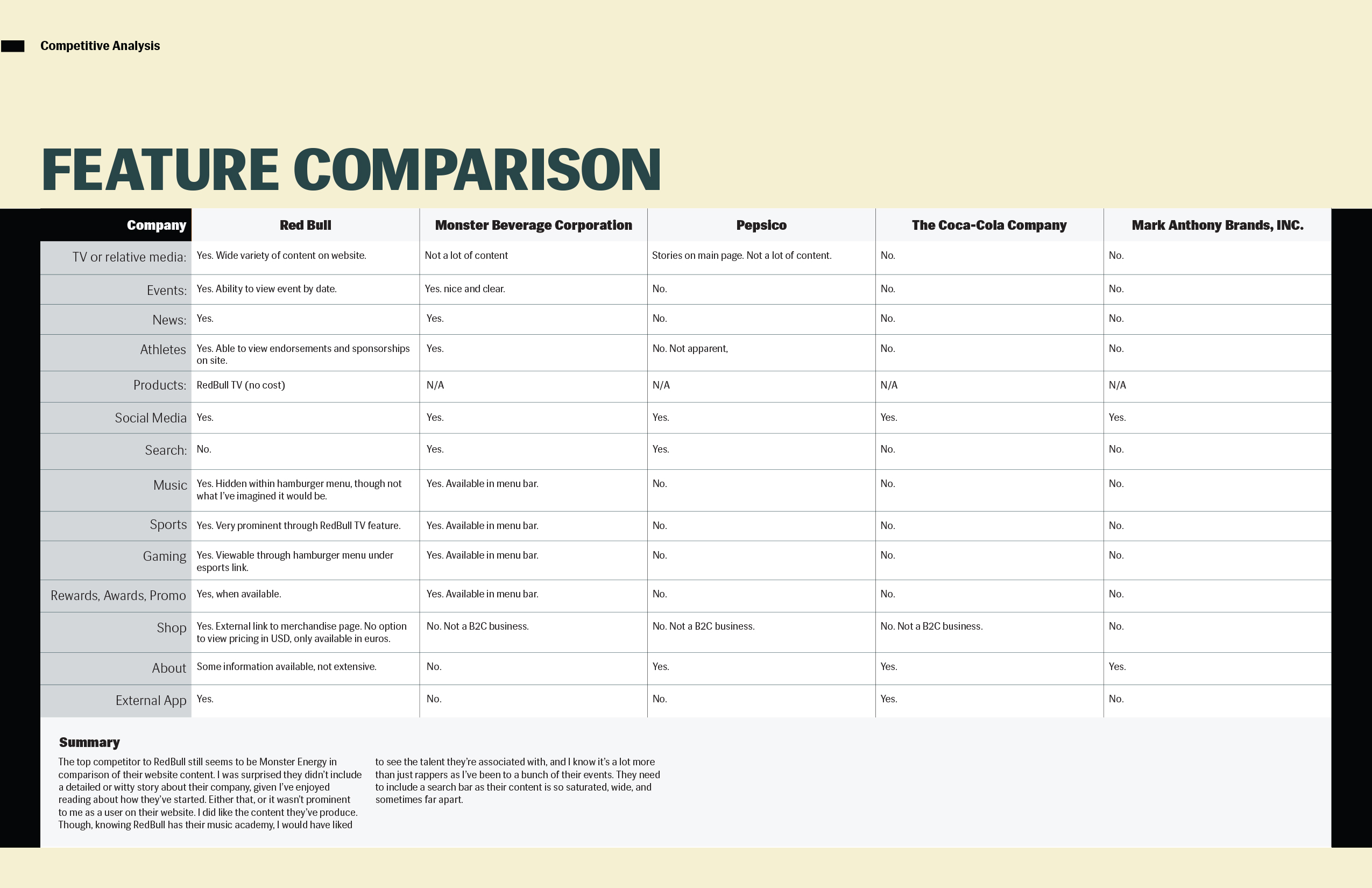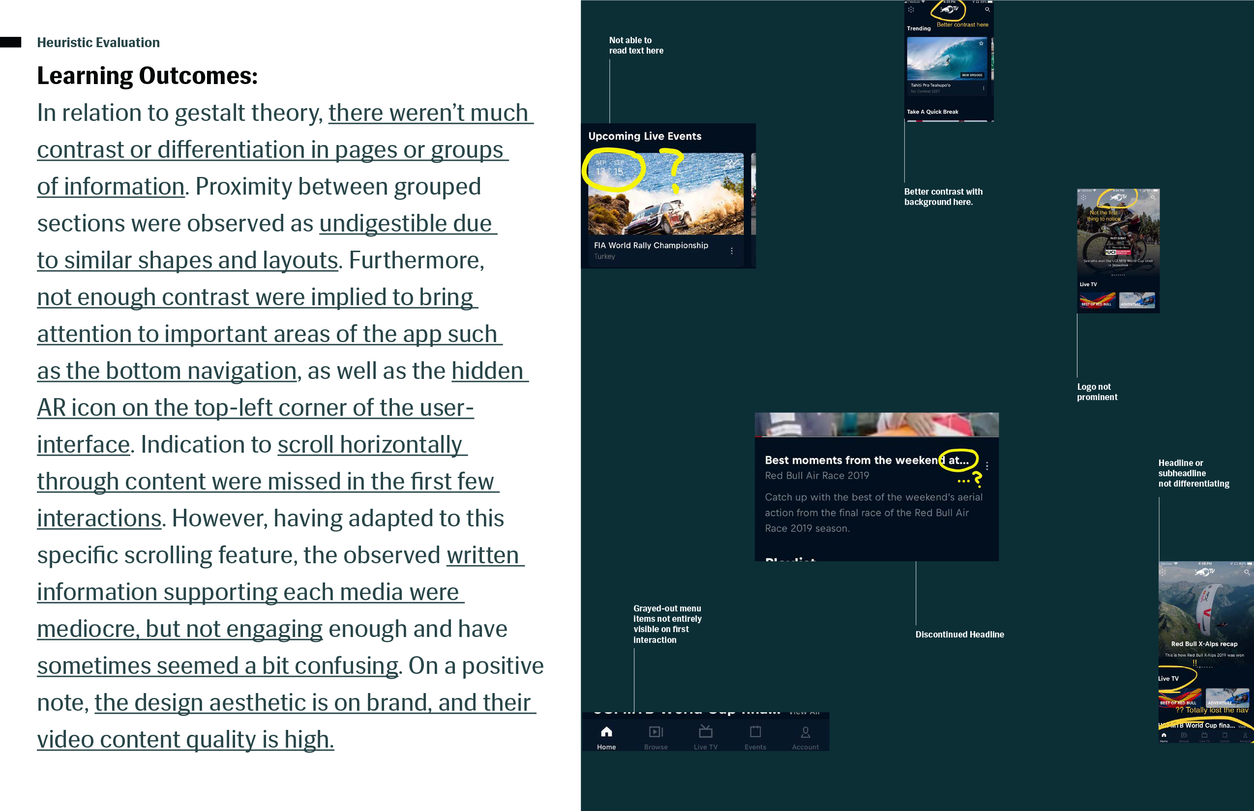 The In-App Event Organizer for the Red Bull TV Mobile app is for Red Bull TV users who go to live music events, but are inclined to not participate due to a lack of information and perceived disorganization of the general event service process. This is to engage the current audience in Red Bull events through the Red Bull TV app, increasing the interaction between users and content within the Red Bull event space. And unlike YouTube and Ticketmaster, my product will not only cover the event live, but give users the freedom to explore an event prior to purchasing in-app. In addition to organizing event information conveniently in one place, users who have purchased tickets to an event in-app are able to exclusively check-in digitally, bypassing long general admission lines and increasing user retention for the mobile app by serving a need for the user.